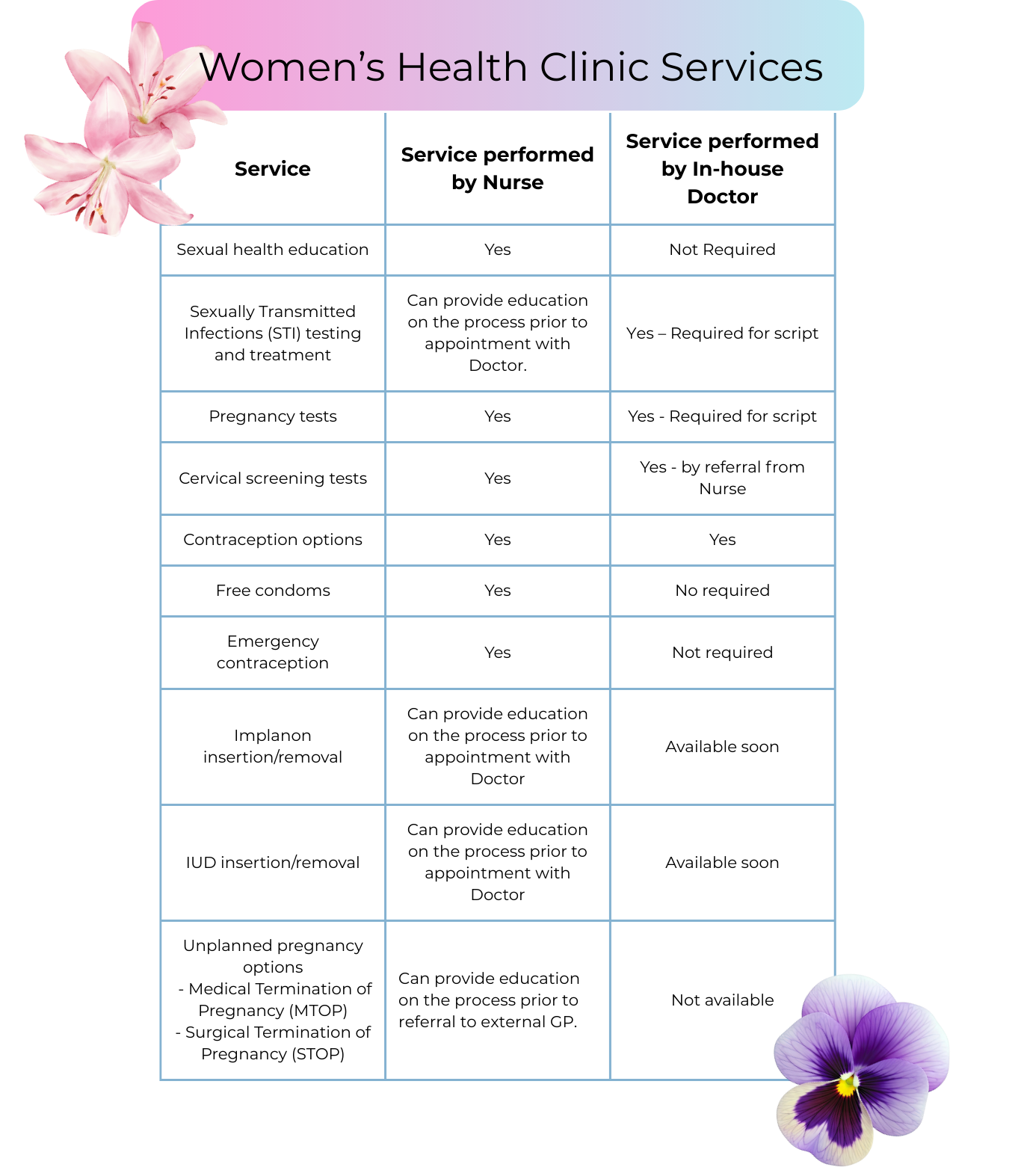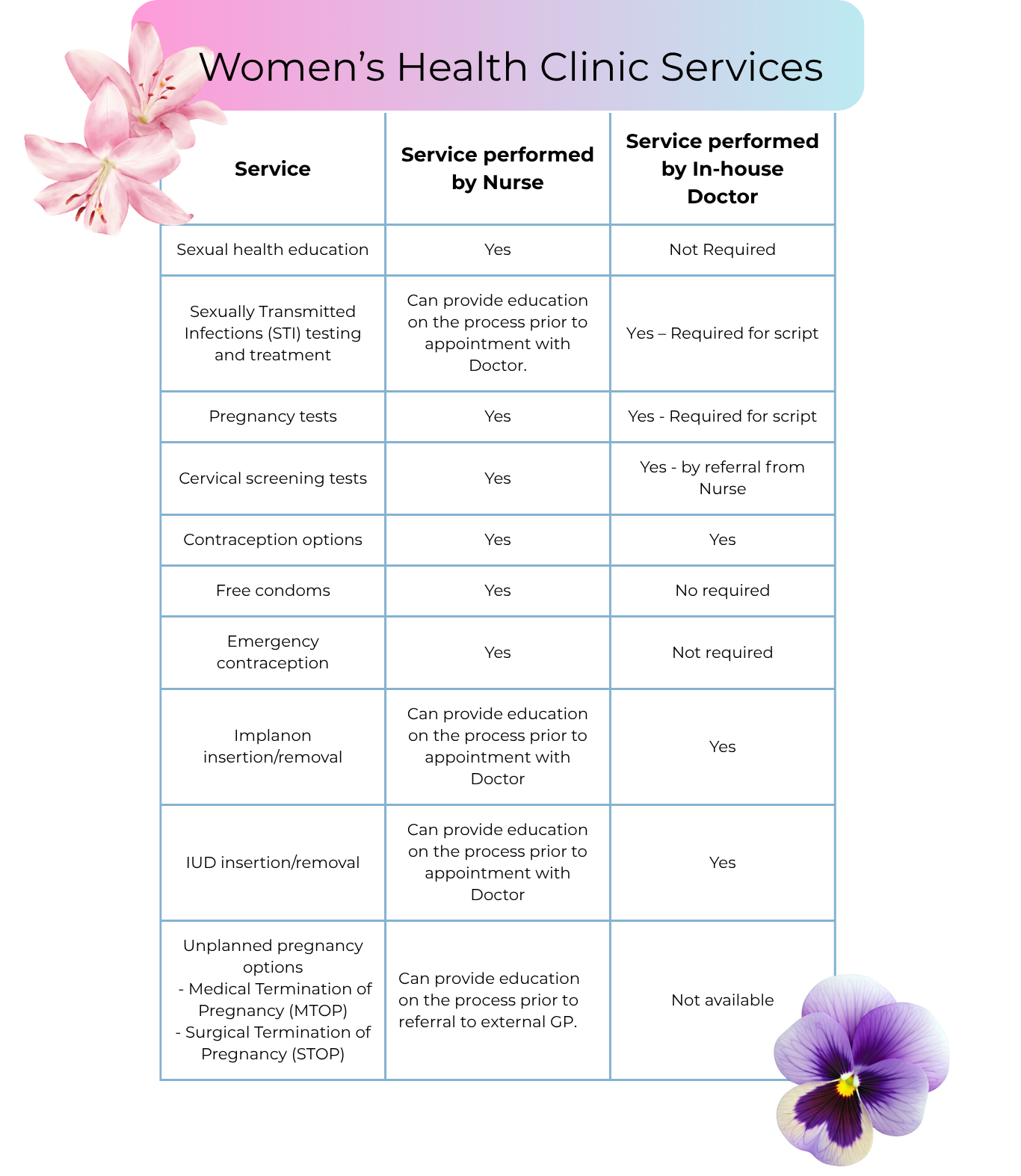 For more information on the services available through the clinic, please see below. Depending on which service you need, either the Nurse or Doctor will see you for your appointment.